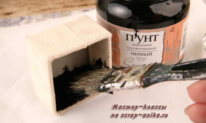 Почему грунтовкой, а не акриловой краской? Грунтовка имеет другой состав по сравнению с краской. В ней есть смолы, проникающая способность более глубокая, а главное - не забивает фактуру двунитки, быстро и глубоко прокрашивая всю ткань. Если Вы хотите сделать шкатулку светлой, грунтовку выбирайте белую.