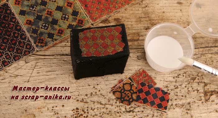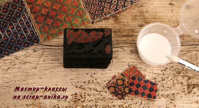 Развела клей ПВА из расчета 1 часть ПВА, 1 часть воды. Нанесла на лицевую часть ящика клей, потом кусочек кальки, сверху - снова клей. Кисточку для клея использовала синтетическую. Так легко сделать декупаж для маленьких деталей. Просушила.