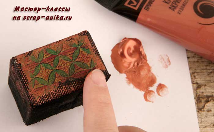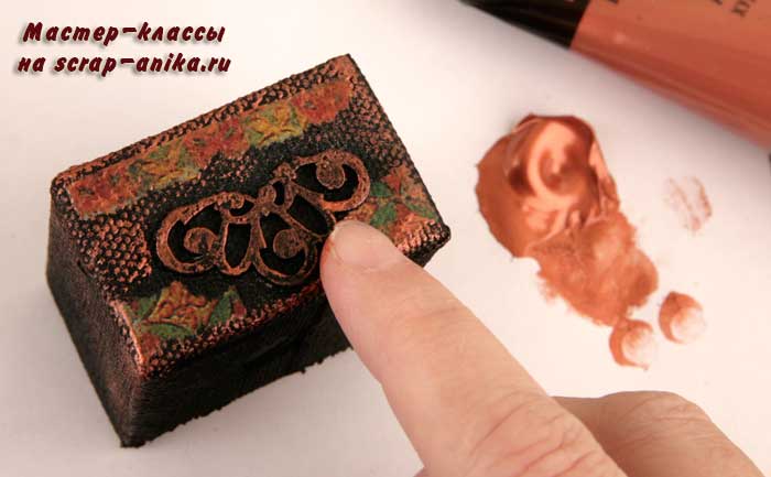 Тонирую медной акриловой краской, слегка касаясь пальцем в некоторых местах, выявляя красивую фактуру ткани.