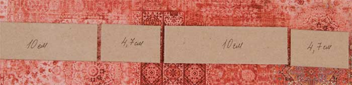 Выкладываю все боковые стороны в ряд, чередуя большие стороны с маленькими (ручкой пометила для наглядности на фото). Расстояние между ними 1,5 мм (толщина картона). Не переживайте, если расстояние будет чуть больше или меньше - в процессе работы мы сможем это откорректировать.