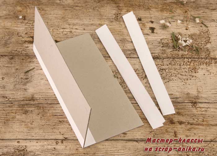 Нарезаю полоски по 4 см шириной, сворачиваю их пополам. Заднюю стенку склеиваю с крышкой с помощью этих полос.
