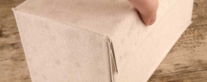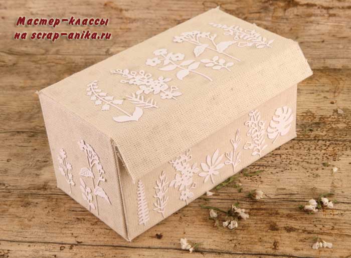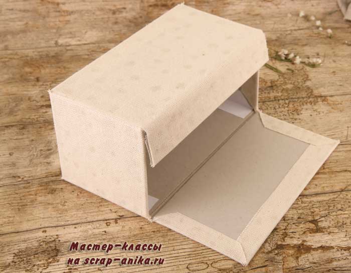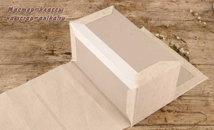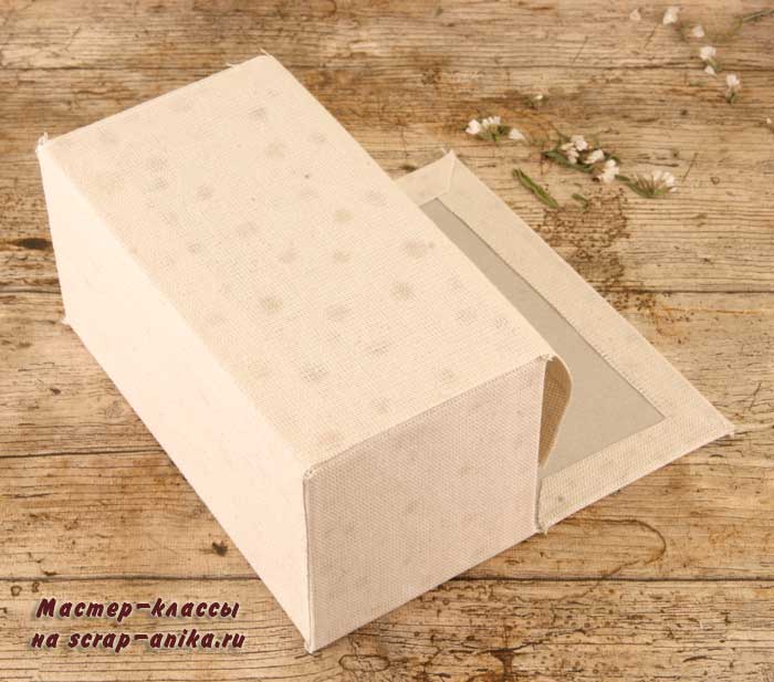 Приклеиваю ткань на заднюю стенку и верх коробки, оставляя припуск на клапан-застежку.