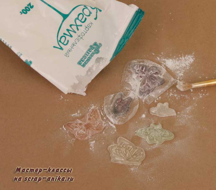 Припудриваю крахмалом штампы с насекомыми. В качестве штампов можно использовать что угодно. Например, декор из полимерной глины, кружева, красивые факрурные поверхности (даже упаковку от конфет).