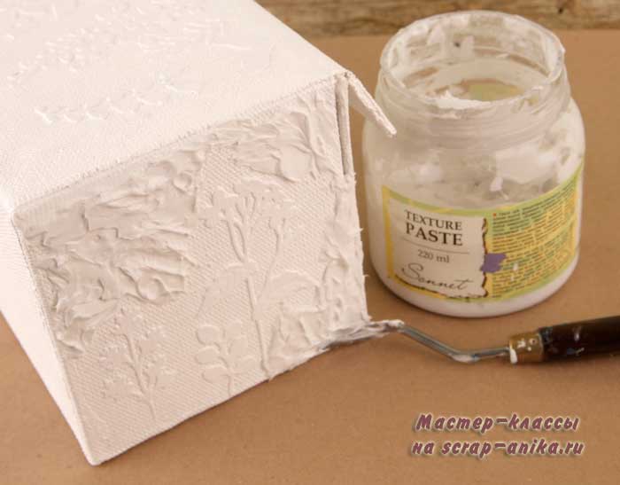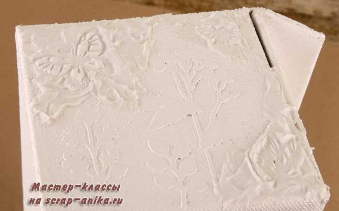 Наношу мастихином в некоторые места текстурную пасту и подсушиваю ее строительным феном. Главное - подсушить только поверхность, а не всю пасту. ВНИМАНИЕ! Не наносите декор на место, где будет застёжка.