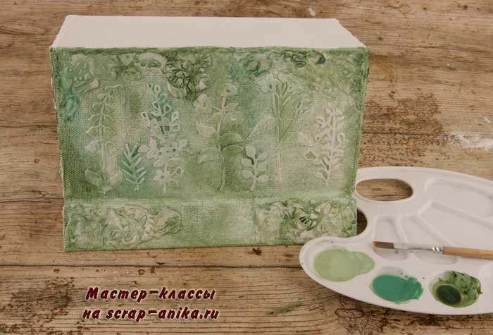 Перехожу к окрашиванию. Хочу акриловыми красками сделать имитацию акварели. Для этого разбавляю в палитре краски водой до жидкого состояния. Наношу так, чтобы были переходы цвета как при акварели. Кто совсем не умеет красить акварелью, есть мастер-класс. Каждую сторону отдельно сушу феном.