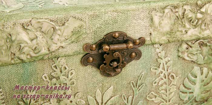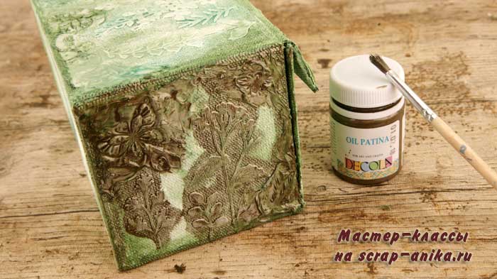 На рельефные элементы и вокруг них наношу масляную патину бронзового цвета. Она заполнит все выемки, выявив красивую фактуру ткани и самого рельефа. Кроме того, патину нанесу на все края. Это создаст эффект состаривания и добавит глубины цвета всему изделию.