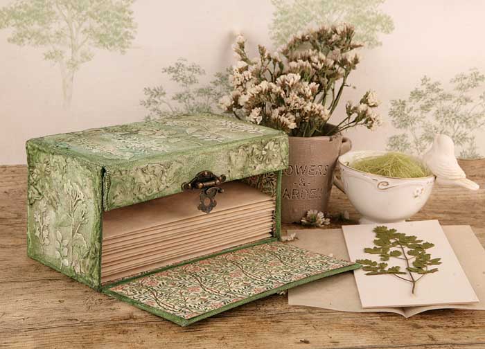 Когда задумалась - какой же должна быть коробочка, решила, что ее главной идеей будет откидывающаяся передняя стенка. Я должна легко находить нужный материал, не вытаскивая каждый раз все картонки и не просыпая хрупкие веточки.