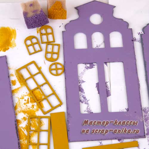 1. Окрашиваем базовой краской все детали с одной стороны. Верхушки высоких деталей - со второй стороны, так как они будут видны. Края обрабатываем тонировочной краской. Декоративные элементы - третьей.