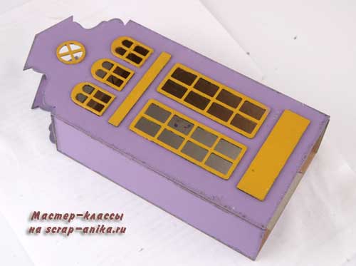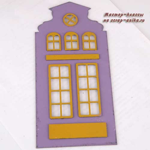 2. Приклеиваем декор на фасаде. Начинаем с окошек - для них есть отверстия и легко найти места для приклеивания. Совмещаем детали четко по отверстиям, клеим на места. Приклеиваем остальной декор. Разметки для них нет, но легко ориентироваться по окнам. Можно добавить еще тонировку красками. Фасад готов.