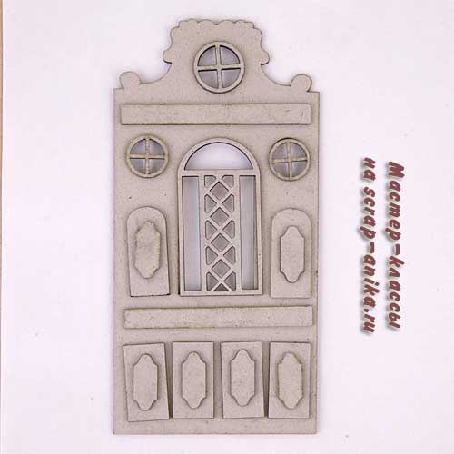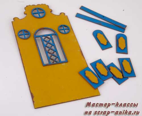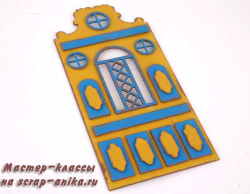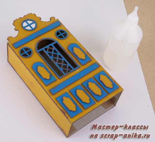 3. Приклеиваем остальной декор на места. Разметки для них нет, но легко ориентироваться по окнам. Можно добавить еще тонировку красками. Я решила, что добавлю воск в некоторых местах, после того, как домик будет готов. А сейчас готов фасад.