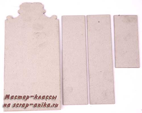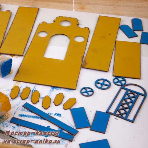 1. Окрашиваем базовой краской все детали с одной стороны. Верхушки высоких деталей - со второй стороны, так как они будут видны. Края обрабатываем тонировочной краской. Декоративные элементы - третьей.
