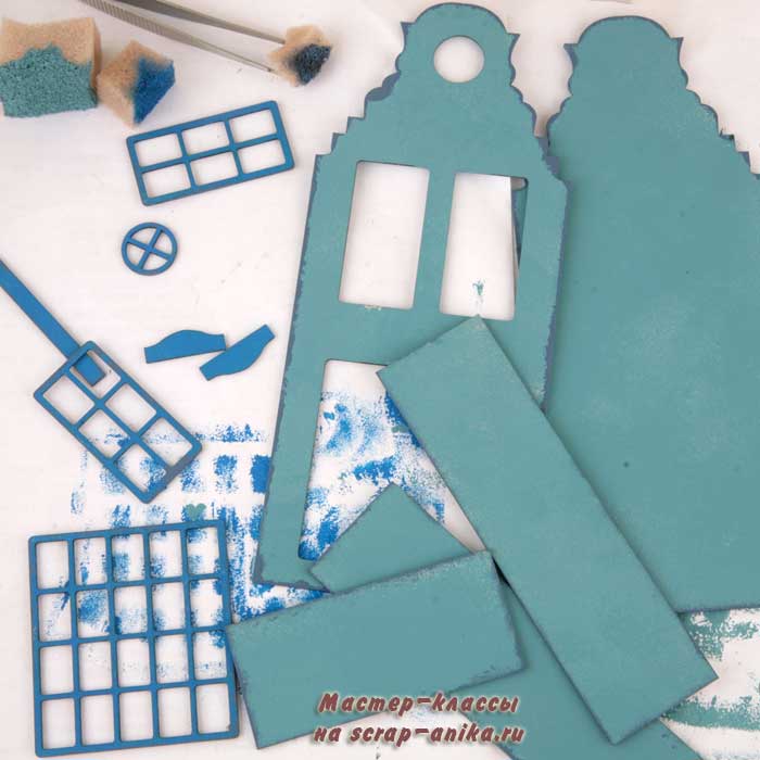 1. Окрашиваем базовой краской все детали с одной стороны. Верхушки высоких деталей - со второй стороны, так как они будут видны. Края обрабатываем тонировочной краской. Декоративные элементы - третьей.