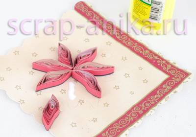 6. Теперь на бумаге выкладываю готовый цветок, намечаю лепестки карандашом и клеем ПВА проклеиваю места, на который потом буду клеить лепестки.