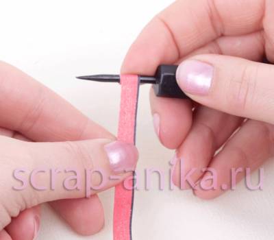 3. Теперь ролик нужно ослабить. Я Отмерила 2,5 см - это и будет длина моих лепестков. Тем же шилом равномерно распределяю ролик. Так как лепесток - отдельная деталь, я сразу приклеила конец бумаги и он уже не увеличится в размере.