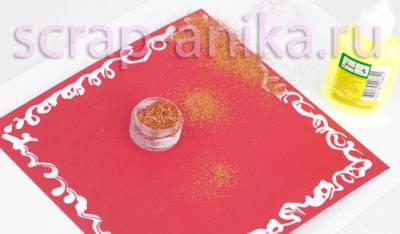 Декорирую простой картон. Для этого в произвольном порядке наношу клей ПВА и густо посыпаю блёстками. После полного высыхания стряхиваю.