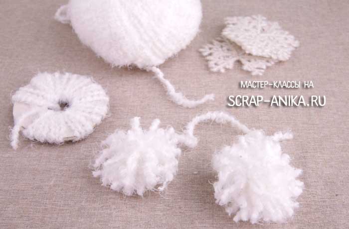 Из небольшого кусочка мягкой декоративной пряжи делаю бубенчики - для ножек нашей овечки.