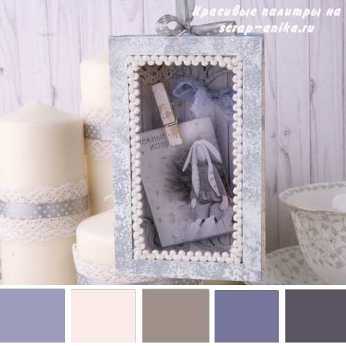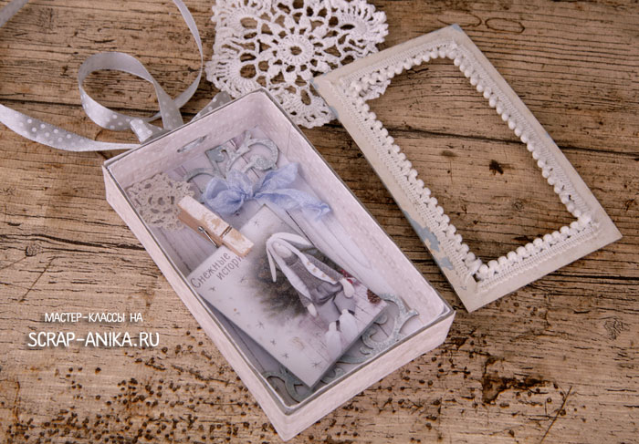 Самая простая по исполнению - Игрушка из простой прямоугольной рамки. Не стала коробочку разбивать на отсеки. Захотелось сделать легкую и в исполнении, и в восприятии. Поэтому цветовую гамму выбрала белый+серо-голубой. Декора по минимуму - несколько завитушек, деревянная прищепка, шебби ленточка, маленькая вязаная снежинка и картинка с зайкой. Подвеска - серая атласная ленточка в горошек. Пикантная деталь - буклированная тесьма (можно использовать кружево) белого цвета. Приклеила ее с обратной стороны рамки.