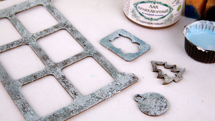 Цветовую гамму своей игрушки запланировала сделать крафт+голубой в эко стиле. Поэтому детали я сделала трехцветные. Сначала окрасила в темно-коричневый, кракелюрный лак, потом голубой, кракелюрный лак, сверху светло-голубой. Мастер-класс по окрашиванию чипбордов можно посмотреть здесь.