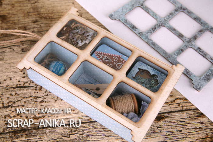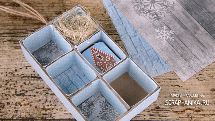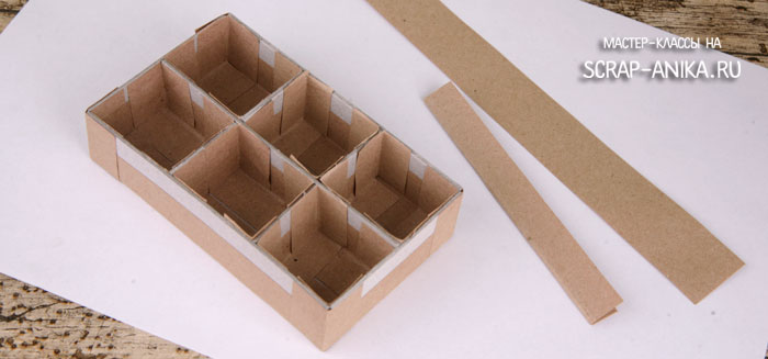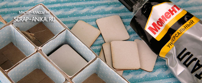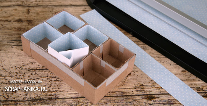 Обклеиваю декоративной бумагой донышки отсеков. В один из отсеков у меня вместо бумаги идет сизаль.