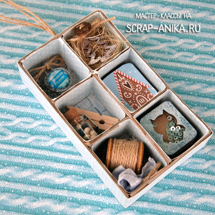 Елочный шарик - та самая окрашенная фишка + стеклянный кабошон + шпагат. На катушечку наматываю джутовый шпагат. В стеклянную бутылочку насыпала деревянные бусинки. Делаю шейкер "Совушка" (мастер класс по шейкерам). Такие мини-шейкеры сделаны размер в размер окошек, поэтому он идеально встанет в один из отсеков. Наполнитель - пайетки голубого цвета.