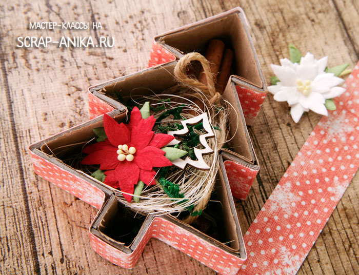 Игрушка - шадоубокс "Елочка" - один большой отсек. Самое трудозатратное - склеить основу из переплетного картона. Наполнение простое. В коробочке разместились палочка для корицы, сизаль, зеленый мох, цветок пуансеттии из тутовой бумаги, чипборд "елочка".