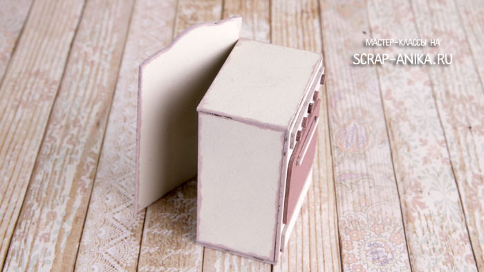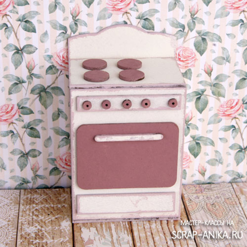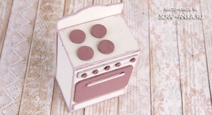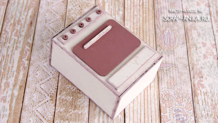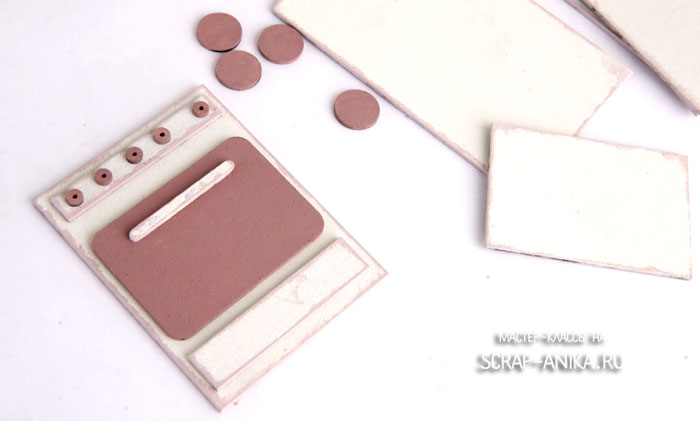 1. Окрашиваем темной краской ручки, плитки и духовку. Базовой краской все остальные детали с одной стороны. Края обрабатываем тонировочной краской.
