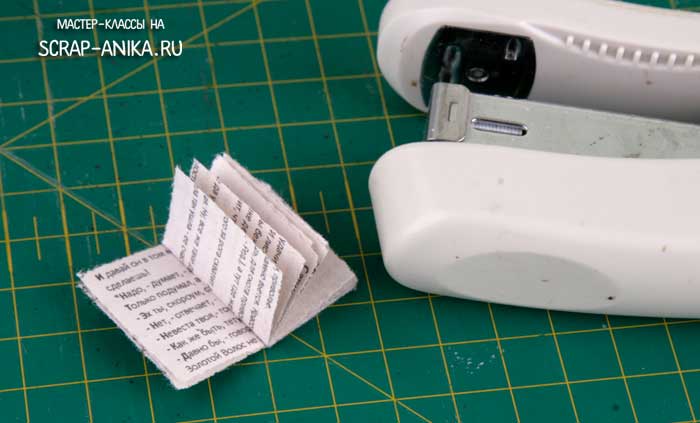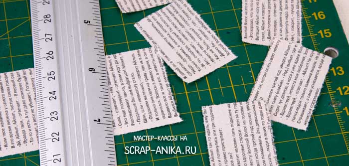 1. С помощью металлической линейки разрываем бумагу с текстом на листочки размером 4х2,5 см. Для одной книжки нам потребуется 7-10 листиков. Учитывайте направление текста.