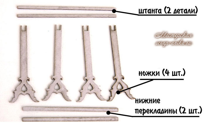 В комплект входит: 4 ножки, штанга (полоски, шириной по 3 мм - 2 шт.), нижние соединительные перекладины (полоски, шириной по 4 мм - 2 шт.).