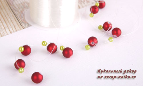 Украсим миниатюрную елочку. Для этого нанизываем на леску бусину и каждую завязываем на узелок. Хорошо сочетать несколько видов бусин, разных по размеру и цвету. Расстояние между ними должны быть небольшими - 1-2 см.
