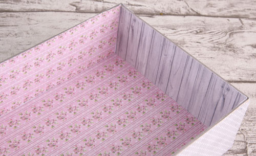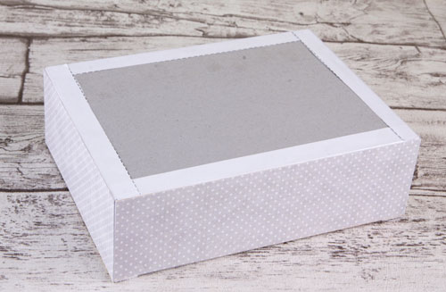 Разрезаем лист по ширине листа полосами по 6 см и обклеиваем внешние боковины бумагой из набора (серые горошки, коллекция 34.7).