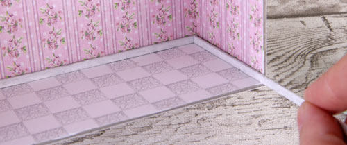 2. Обклеиваем внутренние стены бумагой из дополнительных листов: стены - обоями с розочками (коллекция 34.3), полы - серыми досками, потолок - серой плиткой (на доп. листе).