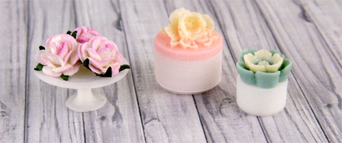14. К фруктовнице приклеиваем 3 бумажных розочки. К основам шкатулок приклеиваем крышечки из акриловых розочек.