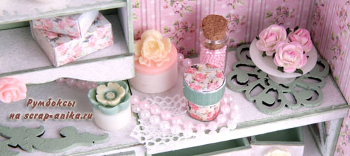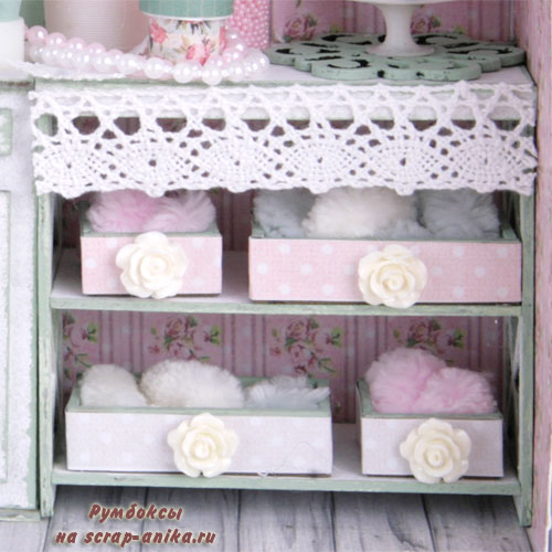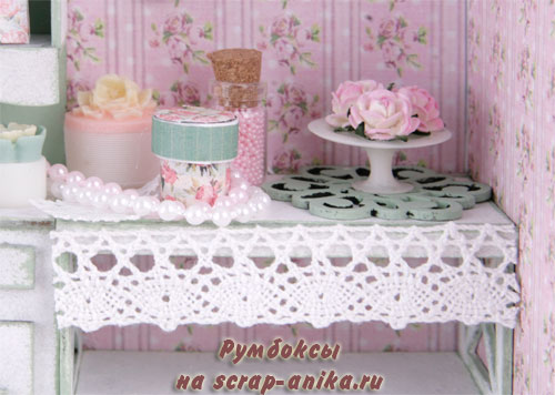 16. Приклеиваем декор на верхнюю часть стеллажа. Не забудьте про жемчуг на нити и кусочек кружева ;)