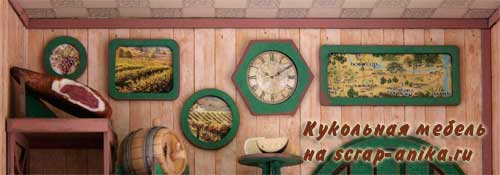 19. Картины и часы. Для настенных панно выбрала рисунок карты Шира (она больше, чем нужно для того, чтобы Вы могли выбрать понравившийся кусочек) и рисунки красивых пейзажей, которые могли быть в этой местности. Окрашиваем рамки в зеленый цвет.