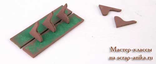 23. Делаем вешалку. Она состоит из основы (2 планочки) и 3-х крючков. У Вас в наборе 5 крючков. Окрашиваем их все темно-коричневым. Планочки красим в зеленый. Три крючка пойдут на вешалку, остальные пока откладываем.