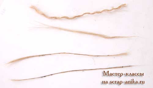 26. Еще в наборе есть кусочек бечевки. Разъединяем ее примерно на 4 части. Чуть смазав клеем, скручиваем нити - получим тонкие верёвочки.