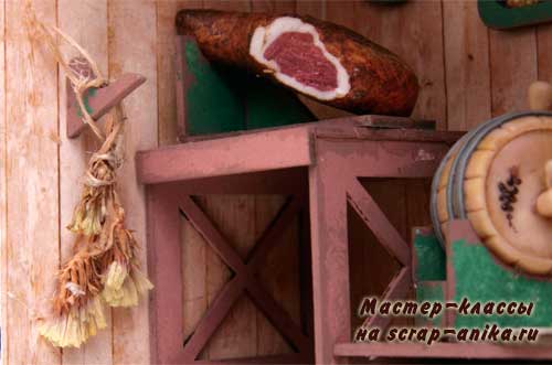Поэтому начинаем изготовление простых, но интересных предметов для нашей кладовочки. Окрашиваем деали зеленой краской, тонируем темно-коричневой.