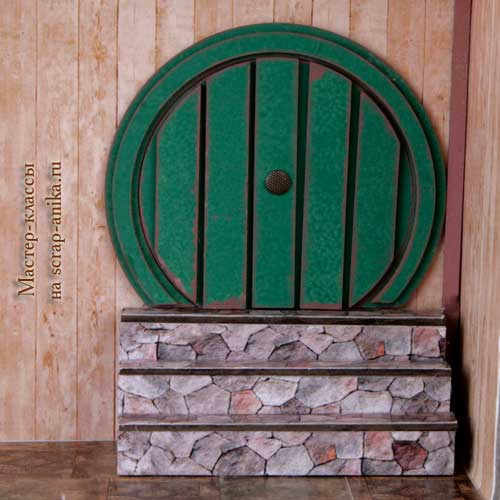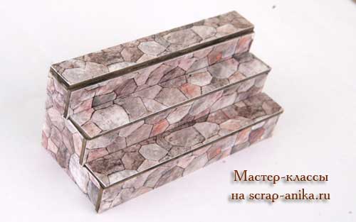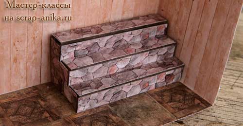 Для оформления крыльца будем использовать бумагу с рисунком каменной кладки (детали находятся на листе 2). Вырезаем и приклеиваем к деталям чипборда. Собираем крыльцо по мастер классу.