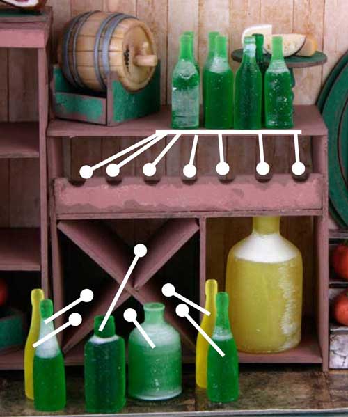 Приклеиваем современные бутылки в шкаф как на схеме. 7 Винных бутылок у нас идут на верхнюю полку бутылочного шкафа. Остальные - смотрим по схеме.