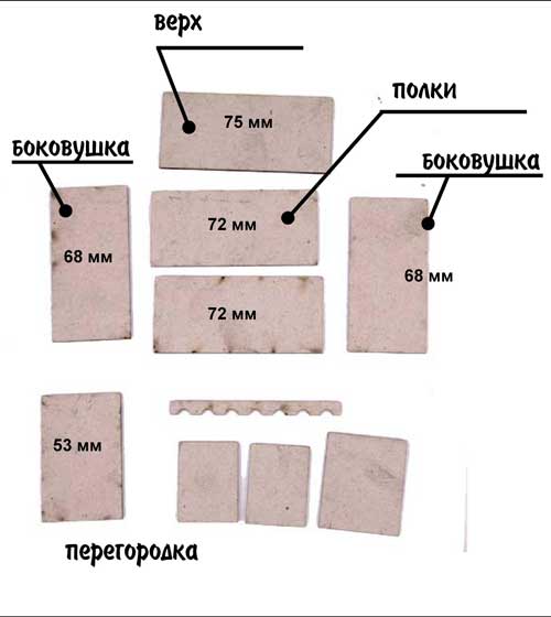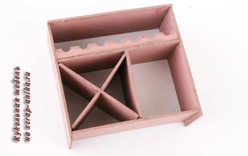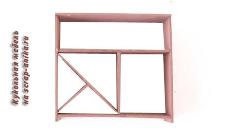 5. По уровню длинной перегородки вклеиваем вторую полку. Вклеиваем вертикальную перемычку (40х33 мм).