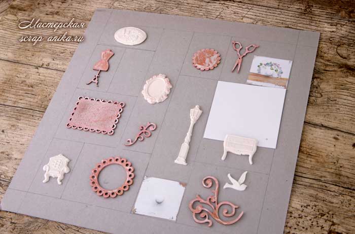 В процессе работы решила добавить фотографии и сделать их больше по размеру, чем задумала изначально. Поэтому имитированные ящики обрели новое место, а элементы может быть буду использовать не все, что запланировала изначально. На самом деле, у меня в работе это происходит частенько - на то он и творческий процесс ;)