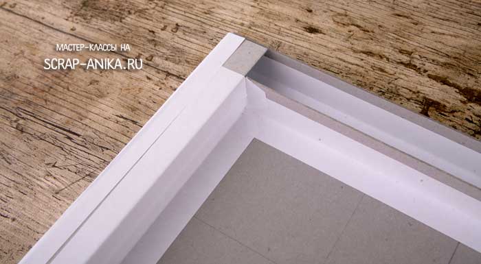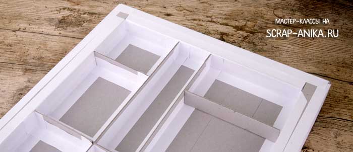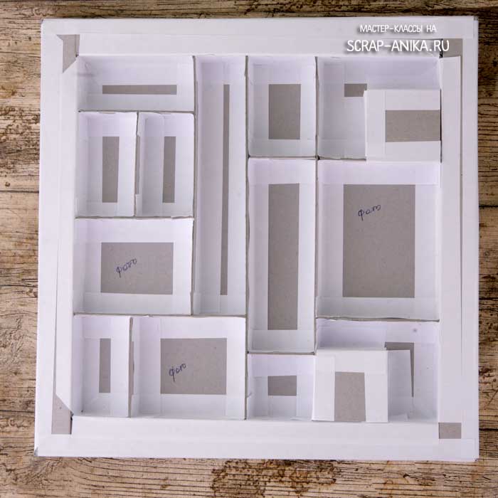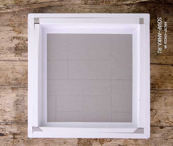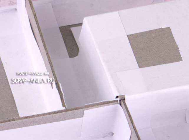 Ящички - имитация. Хочу их сделать на уровне внешней рамки. Вырезаю квадратик из картона и ставлю его на такие же ребра. Проклеиваю полосками.