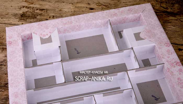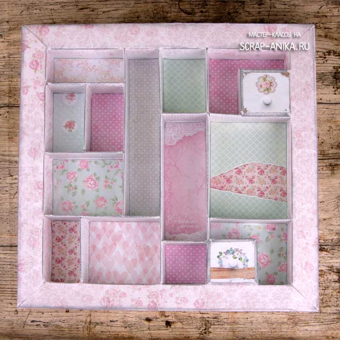 Заклеиваю все секции бумагой. Ящички тоже клею на место. Итак, основа готова. Впереди нас ждет творческая часть.