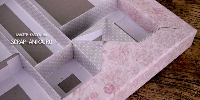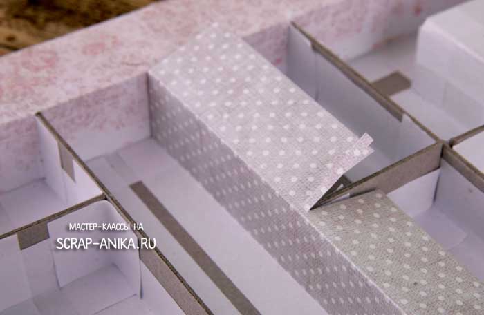 Перехожу к обклейке внутренних перемычек. Для этого вырезаю полосы шириной 5 см из плотной бумаги в горошек 29х30 см (мне понадобилось 2 листика). Делаю сгиб пополам. Делаю надрезы в перемычках и приклеиваю.