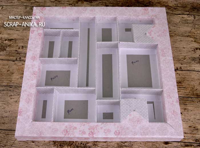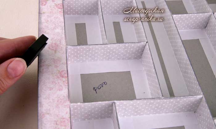 Несколько рекомендаций. Старайтесь делать отсеки не симметричными. Пусть присутствуют и горизонтальные, и вертикальные. Прежде чем начинать клеить коробку, продумайте композицию, набросайте детали, подберите фотографии и бумагу, найдите им место и размеры.