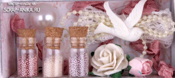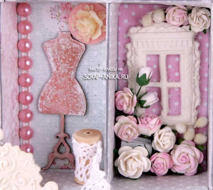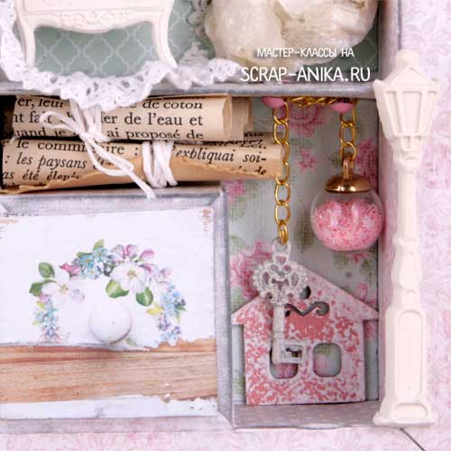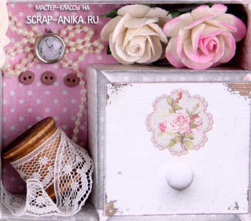 Я люблю, чтобы было всего много-много. И на разных уровнях. Что-то делаю в глубине отсека, что-то приподнимаю на поролоновых подушечках с двусторонней клейкой стороной. В работу идет всё! Вот уж точно есть где разгуляться фантазии. Я Вам специально каждый отсек покажу близко, чтобы Вы разглядели и вдохновились )) Две вещи, которые стоит соблюсти - цветовое решение и стиль.