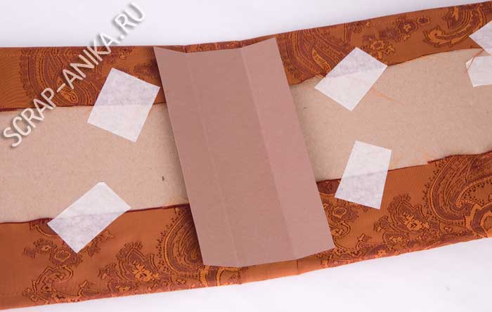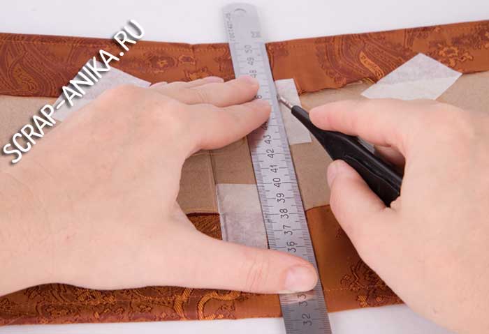 У нас горизонтальные листы альбома размером 21х15 см каждый. Обложка цельная 50х18 см. Делаем 2 биговки по центру обложки. Одна пройдёт на расстоянии 23 см от края, вторая на расстоянии 23 см от другого края. Между ними получится 4 см - это и есть середина нашего альбома. Сложите в стопочку Ваши страницы и посмотрите - какой высоты альбом нужен Вам. Можно сделать с запасом - ведь мы делаем альбом на шнурах и у нас есть возможность добавлять листы. Биговку можно сделать перед тем, как отвернули ткань (особенно, если Вы использовали плотную ткань. Мой шелк мне не был помехой.