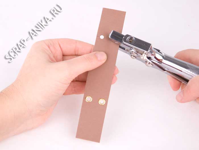 Вырезаем из плотного картона планку размером 30х165 мм. Она-то и будет держать наши альбом на шнурах. Поэтому, если у Вас не достаточно плотный картон, сделайте планку двойной. Пробиваем на этой планке 4 отверстия щипцами для установки блочек и люверсов и ставим блочки.