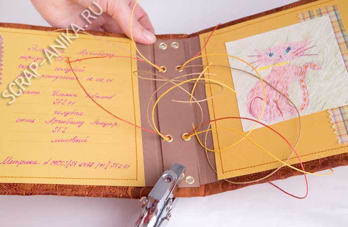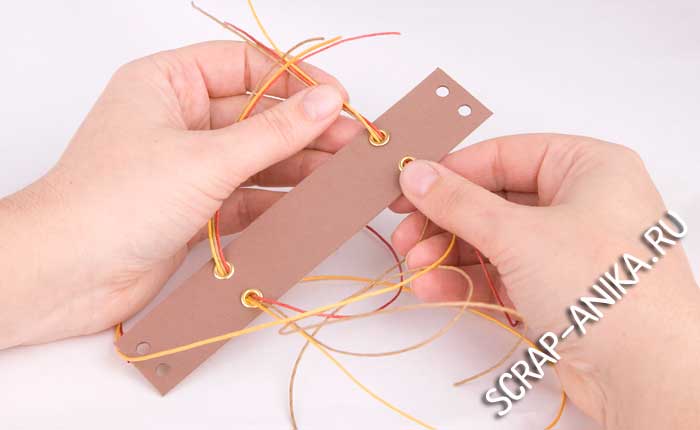 Продеваем разноцветные шнуры. Отрежьте их с запасом, чтобы потом Вы смогли на них нанизать все листы альбома и завязать их на узел или бантик. Я сначала примерила один шнур, а потом отрезала и остальные такого же размера.