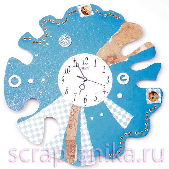 Я сделала в таком стиле ещё одни часы - голубые. Заметьте - бумагу с одной стороны я побрызгала из флакона золотой краской и на ней получились такие симпатичные кляксы. Добавила интересную дизайнерскую деталь из полимерной глины: